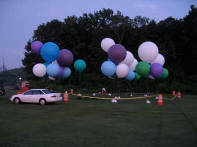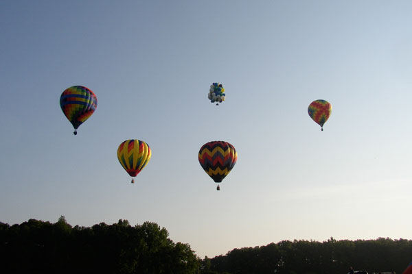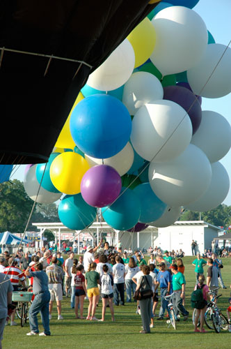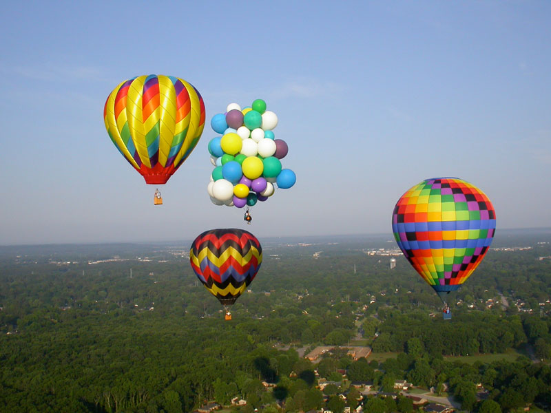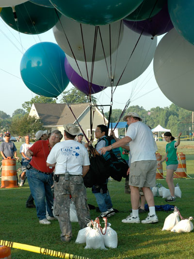 I had crew release me. My balloons pulled me lightly off my feet, carrying me up into the air while the huge hot-air balloons rose up all around. |