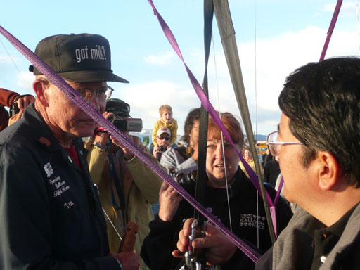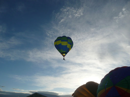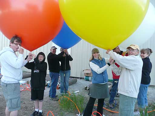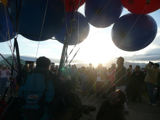 Tom put the balloon launch on hold for a few minutes, hoping the wind direction would change. The next pibal went a bit more to the north, and not quite as fast. Ten minutes later, the direction was straight north, and the speed had dropped a bit more -- ideal for a nice flight up the valley. Satisfied, Tom told the hot-air balloons to start inflating. |