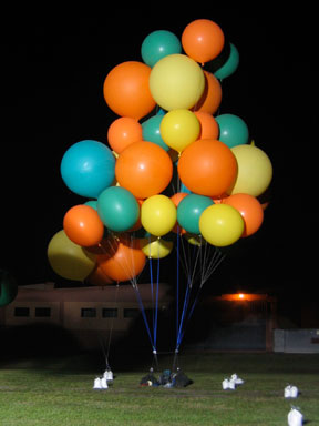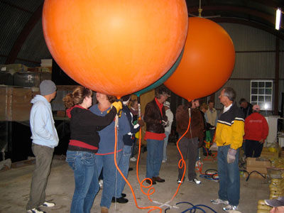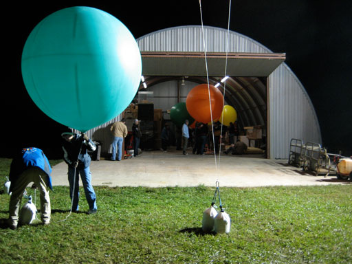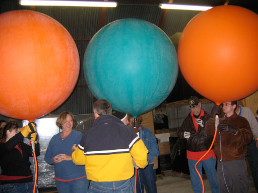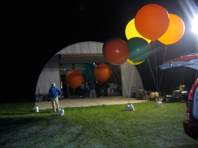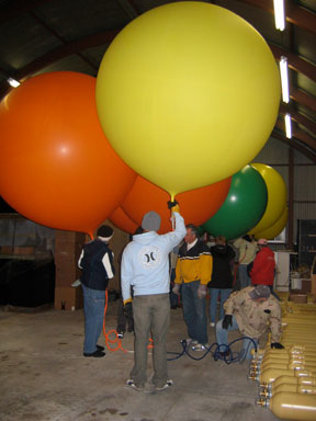 My crew chief Bob Dunnington, his wife Edie and my girlfriend Marj traveled to Florida to assist with the flight. We were given the use of a little quonset hut on the edge of the runway for the inflation. Based on Bob Carlton's report of some windiness before dawn on the day before, I decided to do the inflation inside the hut. It turned out to be an unnecessary precaution, as conditions on the ground were very calm, although we did get to see how many people and balloons will fit inside a quonset hut. |
