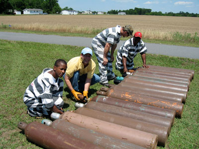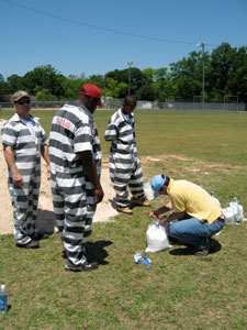 The tireless volunteers of the Sheriff's Work Detail were there to help set up for the Relay. Along with some of the the Relay organizers, they gave Roland and I a hand with filling my sandbags and laying out the helium tanks. |