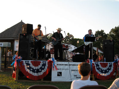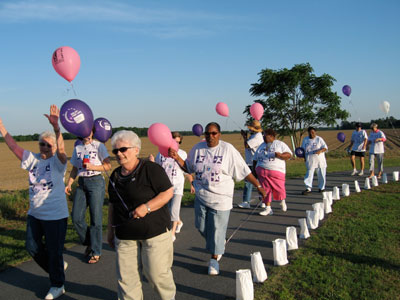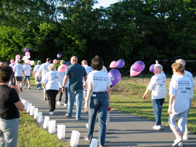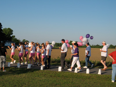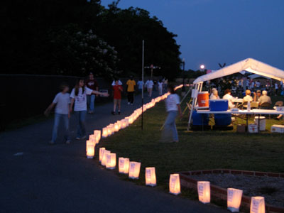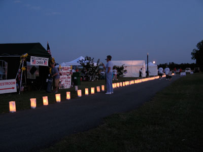 | The Taylor County Relay for Life began that evening. The Relay for Life is a program sponsored by the American Cancer Society at hundreds of locations across the country. Relay teams set up camp and walk around a track all night to celebrate survivorship and raise money for cancer research and support programs.The Taylor County Cheerleaders led the opening lap around the track, chanting "Celebrate Life -- Celebrate America!" while the cancer survivors in attendance followed them, somewhat less perky but still in good form. A band provided entertainment, and the various relay teams sold food as a fundraiser. Later, luminarias encircling the track were lit in honor of a survivor or in memory of someone who died from cancer |