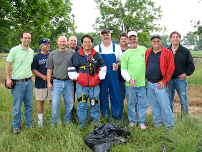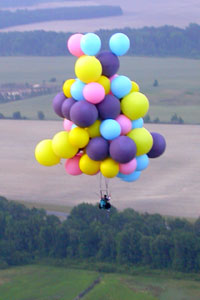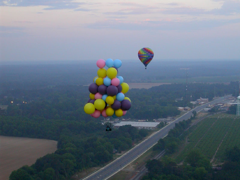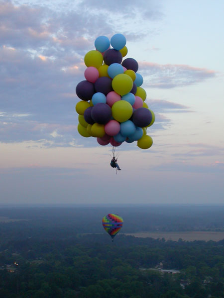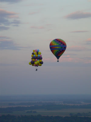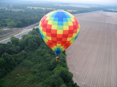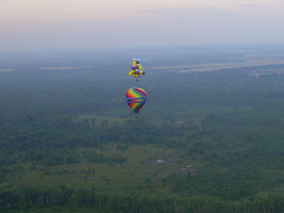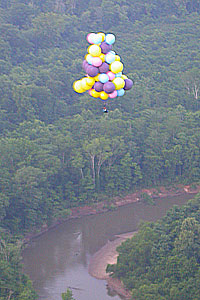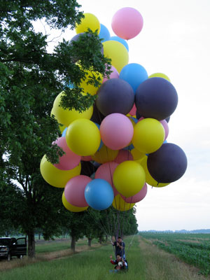 I was still moving fast, but as I dropped in the last hundred feet, I could feel little wind on my face -- a good sign, meaning that I was decending into slower winds below. I cleared the first row of trees by about ten feet and dropped some ballast to cushion my landing. I landed lightly on my feet in rows of ankle-high corn, still with some good forward speed from the wind. I began running -- that being the only alternative to dragging -- stepping between the rows so as not to damage the crop. I couldn't see the truck, and knew that I would have to stop myself. As I ran/floated across the field, I managed to line myself up with a gap between the trees in the second line of trees I was coming up on. As I reached the edge of the corn, I cut away six or seven balloons. I passed between the two trees, digging in my heels, and finally managed to stop at the base of the embankment leading up to the railroad tracks. I called Roland on the radio again, and a few minutes later he and Jimmy arrived in my truck.