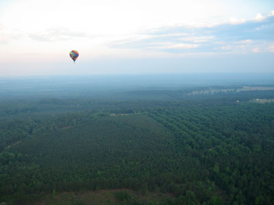 We finally emerged from the far side of the swamp back into farm country. Roland and Jimmy Whitley, a local man who was navigating for Roland, had crossed the Flint on the state highway and were working their way north towards me. I called out some landmarks to them on the radio, and began descending. As I descended, my speed dropped under 20 mph, and then under 15 mph. With my track shifting slightly to the north as I dropped in, I looked for a place to land. Up ahead was a line of trees, followed by a field of new corn, followed by some more trees and railway tracks. I released another balloon to avoid overshooting, trying to set down just past the first tree line at the edge of the corn. I gave Roland some more directions -- he claimed to know roughly where I was heading, but could not actually see me. Then he said he was near John Goddard's hot-air balloon, which was a quarter mile or more north of me.