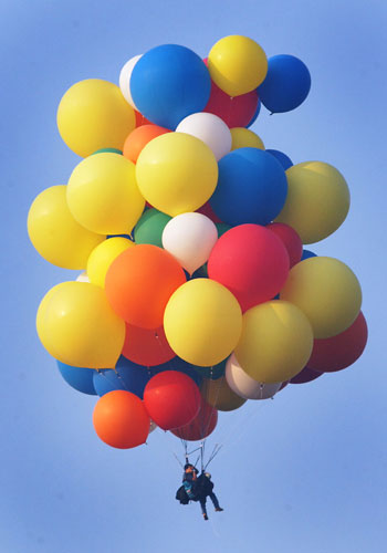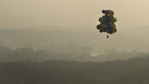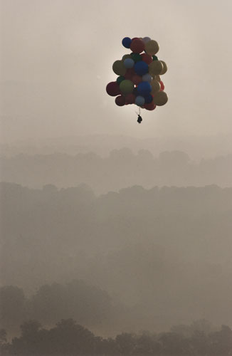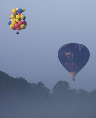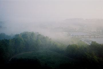 My speed continued to increase, until at seven-hundred feet I was doing about fifteen miles per hour, still to the Northeast. The two hot-air balloons had stay low and were now a mile or two behind me. I released some balloons to level out. Travis called on the radio from one of the other balloons. He told me my best bet to avoid the state forest would be to pass the main highway, then drop in really low in the valley beyond, where there was often a wind that would push me north into open farm country. I acknowledged and waited for the highway. The view over the misty countryside was amazing. |