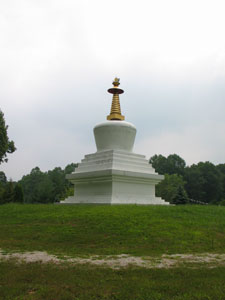 Interlude My fifty-state ballooning performance project, States of Enlightenment, was named as a play on words. Most people seem to get the "states" part, but don't always connect "enlightenment" and "lighter-than-air". I've occasionally had people ask me whether the name refers to some kind of mystical or transcendental experience that I have while flying; my answer is probably not, unless euphoria, adrenalin rush or the occasional moment of terror qualify as mystical or transcendental experiences. However, the name does play on the Buddhist ideas of a state of enlightenment (or Nirvana) and an enlightened one (or Buddha). Not being a Buddhist myself, I hope this is not offensive to any Buddhists or (more likely) to any humorously-challenged PC Police out there. Oddly enough, Bloomington Indiana has some unusual ties to Tibetan Buddhism. Thubten J. Norbu, the brother of the Dalai Lama, was a professor at Indiana University and founded a Tibetan Cultural Center in Bloomington. The center is located on the outskirts of town on South Snoddy Road. The day that I visited was hot and humid. The grounds were mostly empty, except for workers from a local party rental company who were erecting tents in various places.