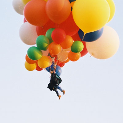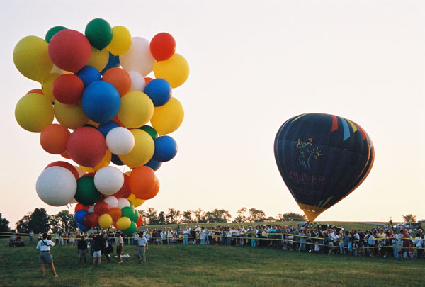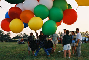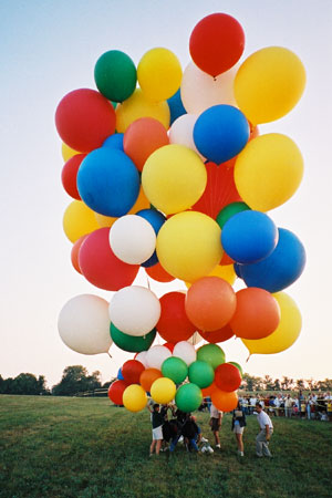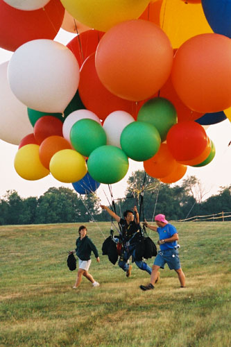Ernie released my tie-down rope, and the balloons started to pull me forward. I jogged forward to keep from being dragged, and crew followed. As I had suspected, as I gained speed, I found that I was no longer positively buoyant. I handed off the ballast bag I had unhooked to one of the crew jogging along behind me. The balloons attached to my legs pulled my feet up off the ground behind me, and the bunches of balloons in each of my hands pulled me up. And off I went on my adventure. |