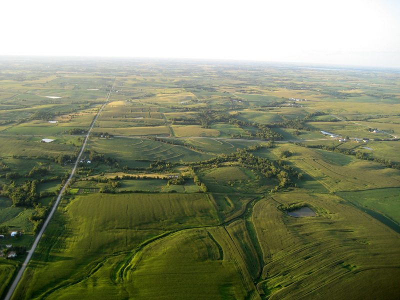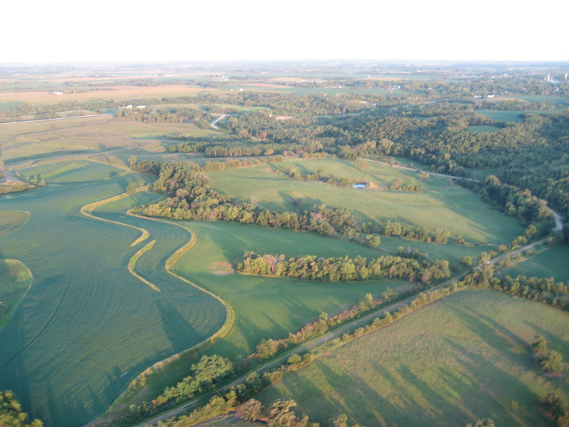 When I got down to four or five hundred feet, I radioed my chase crew that I was starting to look for a place to land. I passed over a few large planted fields, but didn't see any large clear areas to land. At this point the road grid, which had been pretty consistent for many miles, became more irregular. The road I was paralleling dead-ended. I sent the truck half a mile to the south, to where I could see a small town and guessed that there must be an east-west road that would go through. I dropped in to a couple of hundred feet. There were some cut hayfields that looked like plausible landing spots, but with crew trying to detour around to reach me, I didn't want to land. I flew over a few more corn fields. The last field ended at a road, bordered by some powerlines; on the other side of the road was a pond and then a line of trees, and then what seemed to be an unplanted field. I was my truck headed up the road from the south. It didn't look like there was any clear space between the end of the corn and the powerlines, and on the far side, it looked like there was a fence and a steep slope down to the pond. I radioed crew that I was going to try to land. |
