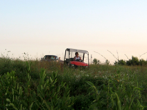 I radioed crew that I was all right, and told them that I thought they could access the field I was in from the south. I could see the truck out on the road, out beyond the trees and the pond, one property to the north. They turned around and went south, but radioed that there was no way in to the field from the property to the south, and went back out on the road to try from the north again. I was getting ready to try to walk out a way when a man and a women rolled up in a little utility vehicle. They asked if I needed help. I explained that my friends were in a truck trying to get in here. They told me that there was indeed a way in from the south, but it was overgrown and hard to see. I radioed my crew to go to the south again. The woman, Mary Jo, drove out to guide them in, while the man, Don, stayed to talk. They lived nearby, and this land belonged to his parents. I learned that I was near the town of Melcher-Dallas, about 17 miles from Indianola. |