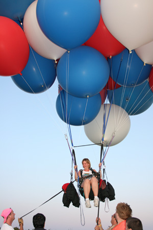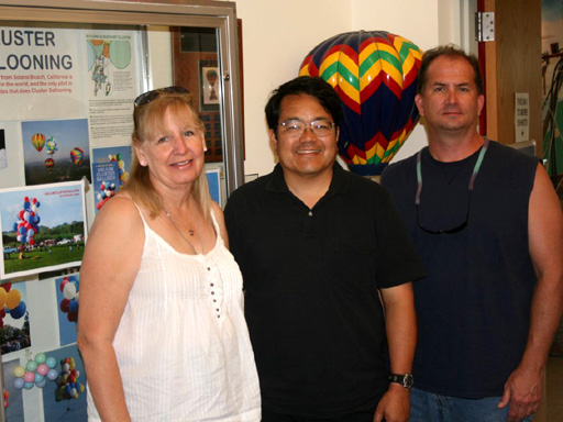 After a few minutes Mary Jo returned with my truck following her. We asked Don if he wanted to go up on tether before we put the balloons away. He'd gone on his first hot-air balloon ride just a few weeks before, and was ready to give the cluster balloon a try. So we let him up on tether, followed by Mary Jo and our volunteer crew from the Classic (Mark, John, Shea and John) and my girlfriend Marj. It was full dark by the time we put the balloons away and bade our hosts good night. |