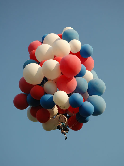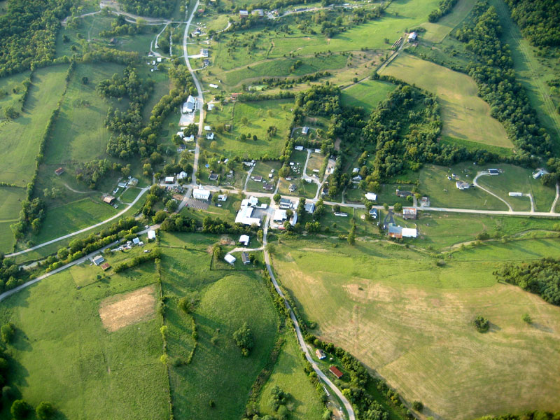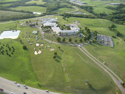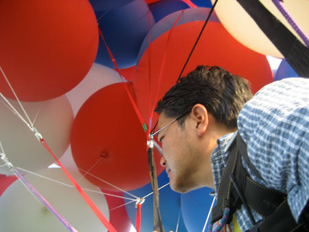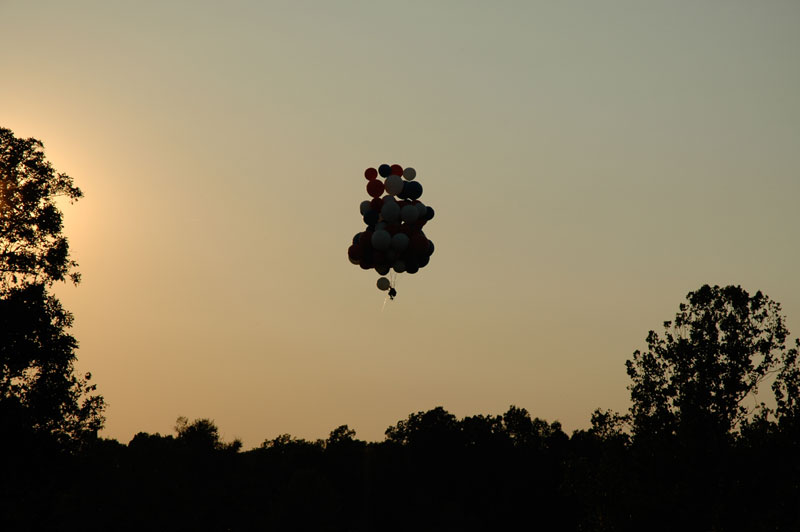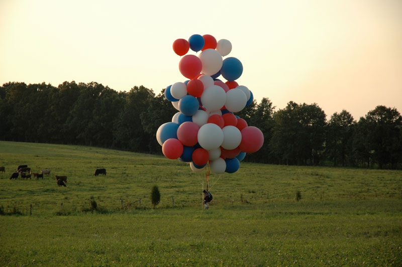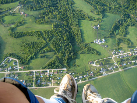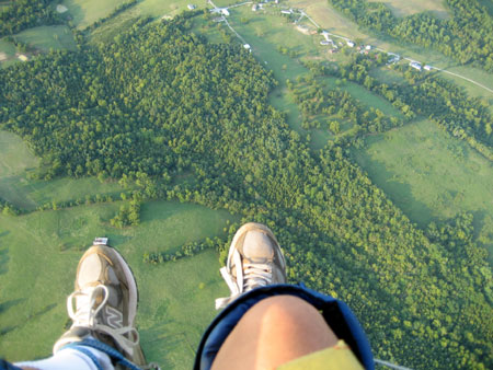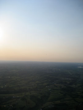 I kicked my feet, relieved to be done with the inflation and on my way. The sounds of the balloon festival faded as the wind took me East across the southern part of Maysville. My speed rose as the balloons took me higher, until I was travelling at about 15 mph. The temperature dropped a few degrees as I rose, which was also welcome. |
