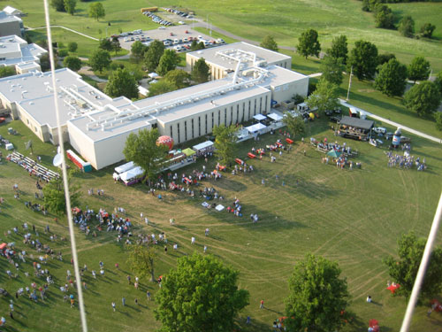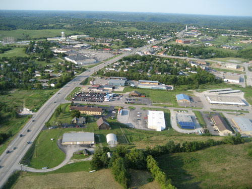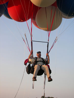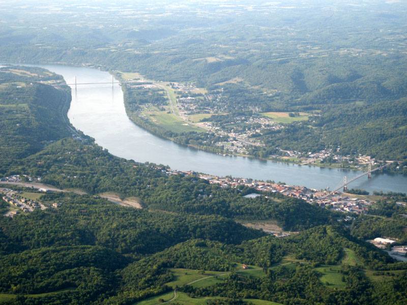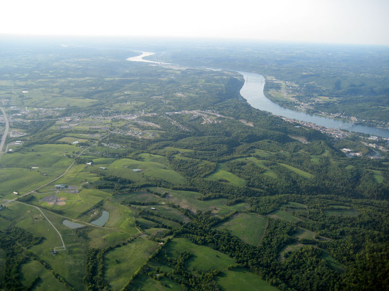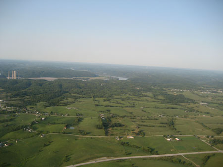 As my balloons pulled me higher, I had a wonderful view of Maysville. I could see the Simon Kenton Bridge into downtown Maysville, and the William Harsha Bridge farther west. Climbing higher, I could also see the southern part of Maysville, the green, rolling hills of the surrounding countryside, and the gentle windings of the Ohio River. |