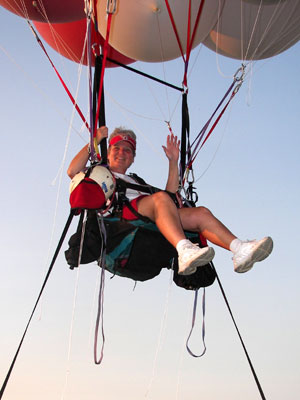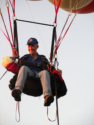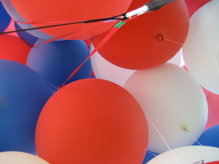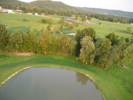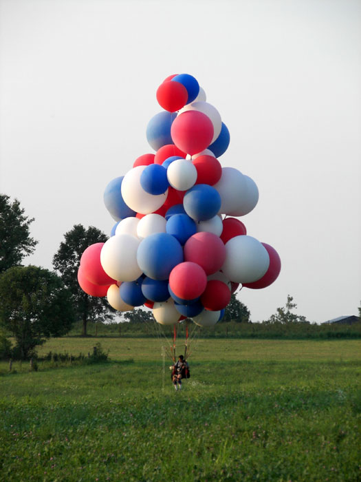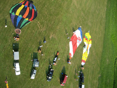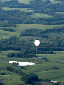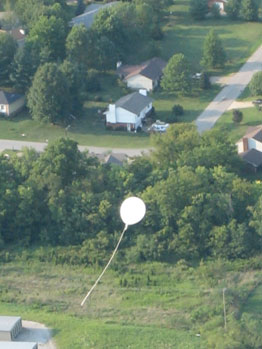 | I radioed Phil and Debbie my intentions, and released a few balloons to start my descent. I gradually slowed from the 15 mph I'd been maintaining most of the flight to 5 - 10 mph a few hundred feet over the trees. |