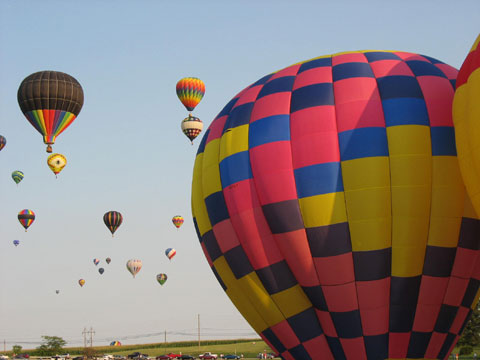 So, that was how I came to be the first balloonist to launch at the inaugural Buffalo Trace Balloon Race in Maysville, Kentucky. The event was a great hit with the community, and raised money for CASA, a child advocacy service. From a ballooning perspective, very few first-year events can boast hosting well over 100 balloons -- even if 90 of them were all lifting just one person. As Rosemary Clooney might have sung: "Come on-a Maysville, Maysville, I'm gonna give you Buffalo, "Come on-a Maysville, Maysville, I'm gonna give you Cluster Balloon." |