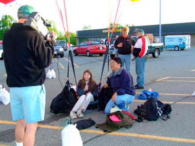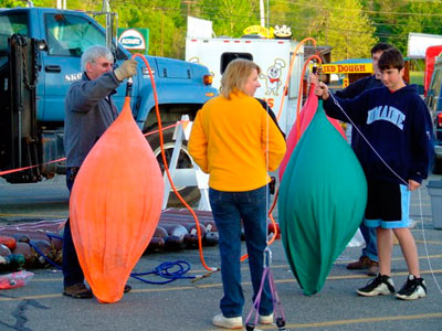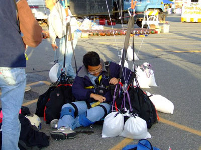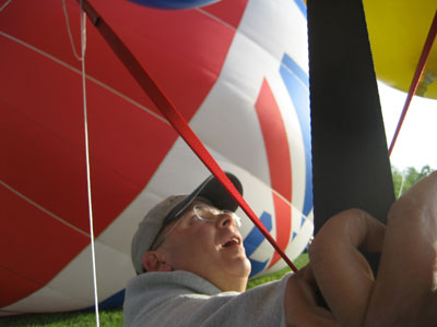 Wind had been a concern for my last two flights, and the windiness of the previous evening had made me wonder if I was in for more of the same. Happily, the forecast seemed to be right, and the calm, clear morning was great relief. I had time to be interviewed by a little girl who hosts her own show on a local public access cable channel. Then, I got into my harness, and crew finished attaching all of the balloons to me. I walked over to the grassy field at the north end of the parking lot to launch with the hot-air balloons. David straightened out all the strings of my balloons while we waited for the other pilots to finish inflating. |