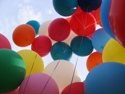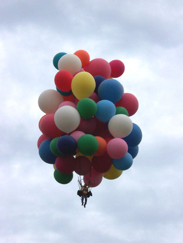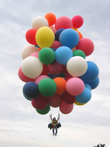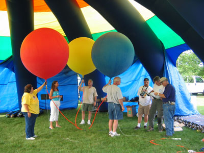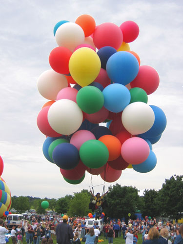 We finished the inflation early, and assembled the balloons into the cluster. A bit of wind came up, bouncing my balloons around and causing us a bit of anxiety. However, as 7 PM approached, a light overcast moved in and the wind calmed. A good-sized crowd had come out to see the balloons launch. I got into my harness as the hot-air balloons began to inflate. Crew attached the balloons to my legs and feet, lifting them out behind me, and I took the bunches of balloons in my hand. |