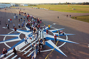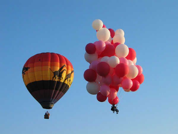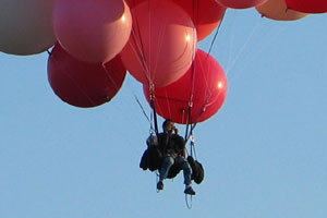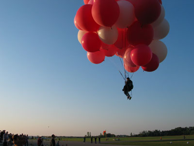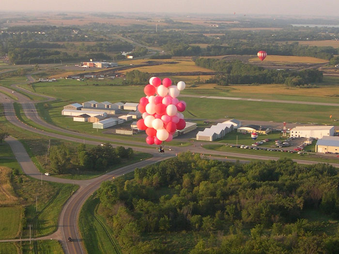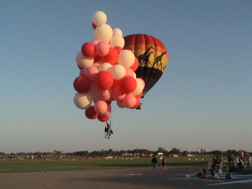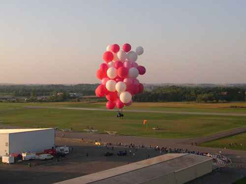 John released the rope attaching him to the ground, and lifted slowly off the ground, drifting off to the north at 5 miles per hour or so alongside Ivan's hot-air balloon. The crowd watched silently. At most events the spectators cheered when the helium balloon man took off, but no one in Faribault knew if you were supposed to cheer at such an event and no one wanted to be the first.