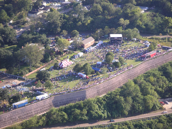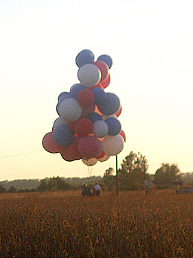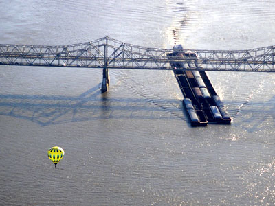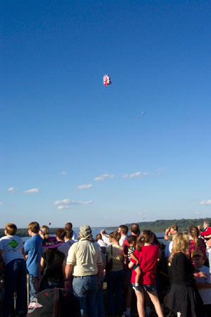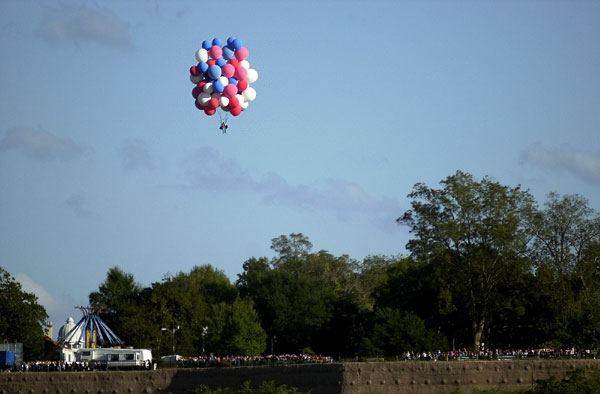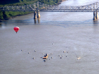 The festival grounds dropped away below me as my balloons carried me out over the Mississippi. |