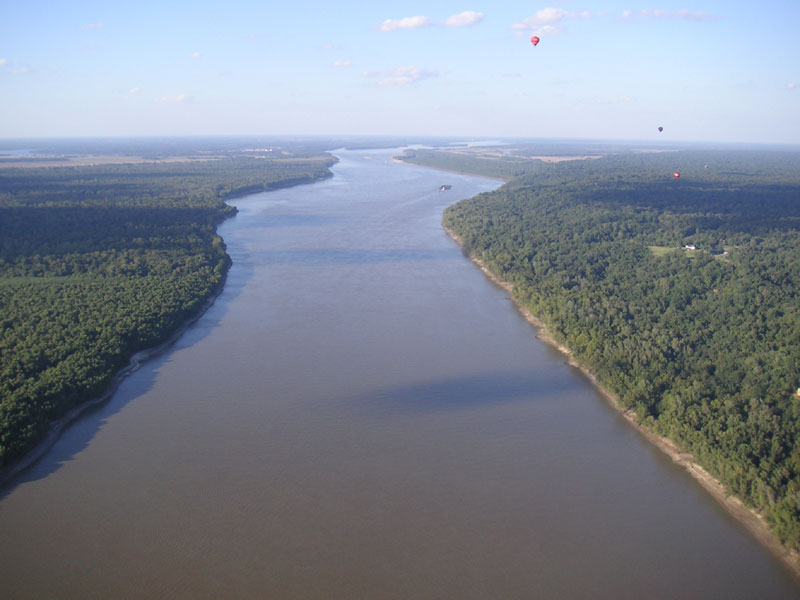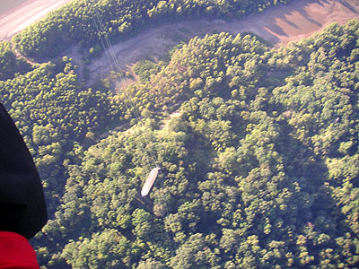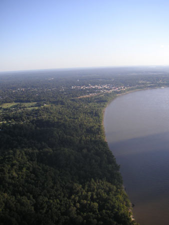 Watching the other balloons, it looked like the lower winds were headed northwest, toward Louisiana, but the upper winds were headed northeast, back onto the Mississippi side -- an ideal situation for maneuvering. I split the difference for a time, heading north up the middle of the river. The Mississippi was very impressive: a wide ribbon of brown cutting through the green of woods and fields, flowing down from the horizon to the north, and away to the horizon in the south. Clouds cast drifting shadows across the water and the woods. A few miles ahead on the Mississippi side, the thick trees gave way to yellow-brown fields, which I guessed was the recommeded landing spot at Anna's Bottom. I called Larry on the radio and confirmed that he was on his way there. |