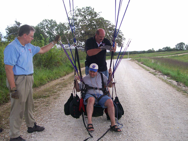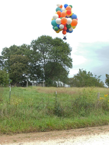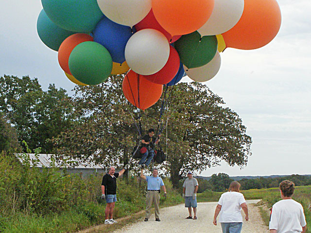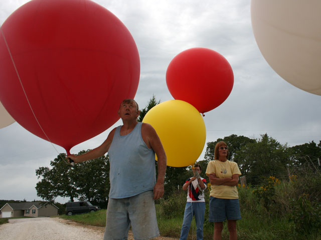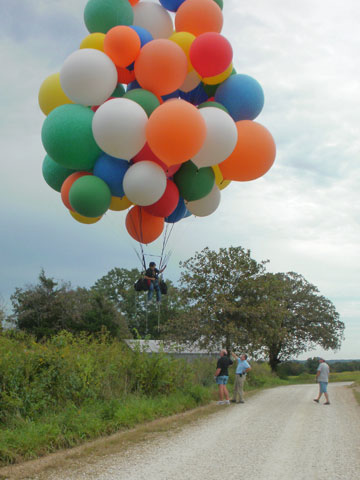 I dropped ballast to clear the trees, then released a balloon to set up a descent to where Bob and Brian were waiting for me on the gravel road -- a perfect landing, other than Brian's insisting on holding me up by one foot for pictures before letting me land. |
