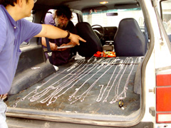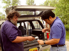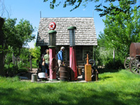 On Saturday it was blowing 20+ mph at 4 AM, when we were to have started the inflation, with lightning on the horizon to the east. The wind gradually died, but by the time it had dropped enough to blow up the balloons, it was already close to dawn, the intended launch time, so I decided not to proceed. Spectators showed up at 6 AM, and were surprised and disgruntled by my failure to fly on what was by then a calm and clear morning. As it turned out, the wind began picking up again at just the time I would have been ready to launch, had I started the inflation when it first calmed down. It seemed that whatever nature spirits rule the weather at Carhenge were in a pissy mood. We rescheduled the flight to Sunday morning. |