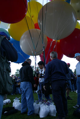 After some concern about the weather, the morning of my flight turned out to be beautiful. My Rotarian and other volunteers showed up at 4 AM to help inflate the balloons. |
