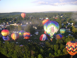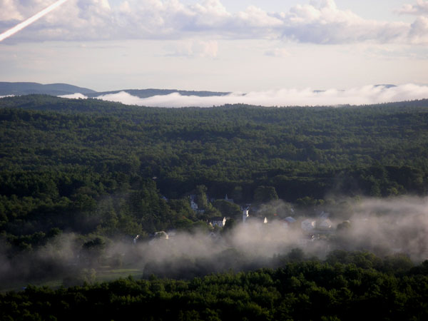 The other balloons were staying low, trying not to travel too far too fast. There was a temporary flight restriction about eight miles to the east, because the President was visiting somewhere in Maine. I leveled out fairly low, too, but enough higher than everyone else that I pulled out ahead the pack. At first there were a fair number of open areas visible among the trees. I passed over a cemetery (the ones who didn't manage to live free, I supposed) and followed the main highway out of Pittsfield. |