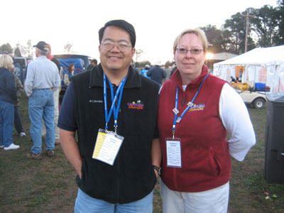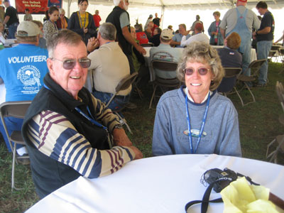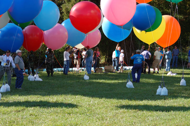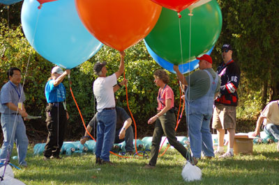 I was scheduled to fly Saturday afternoon. It was still a bit windy at 2:30 PM, when my inflation was due to start, but we had anticipated that and had set my helium tanks in the lee of a grove of trees. At the appointed time, exactly one volunteer was there, but some frantic calling to the festival organizers eventually yielded enough people to do the inflation. |
