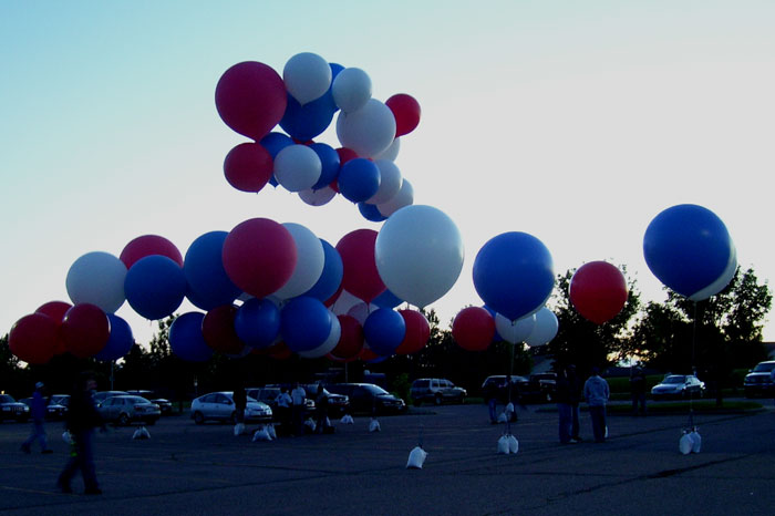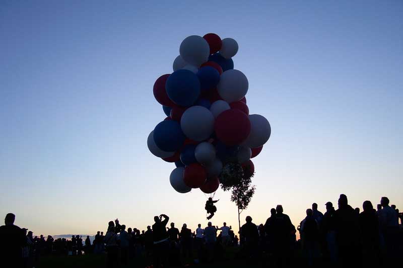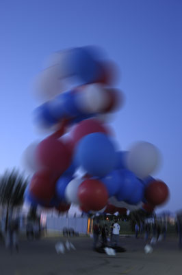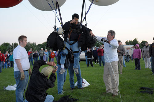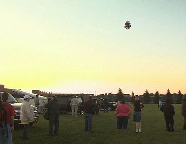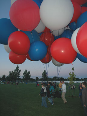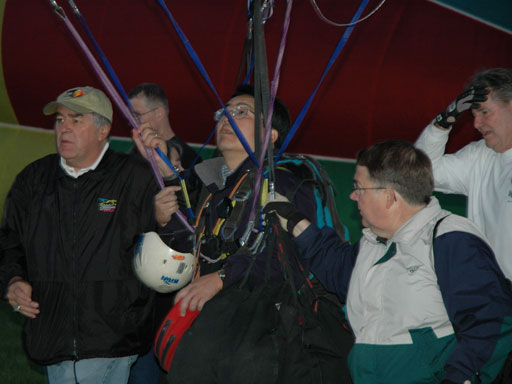 I held off on getting into my harness, seeing that once all the balloons were attached to me, I probably would start to drag around. Then, just before dawn, the winds slowed to almost nothing. |
