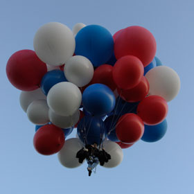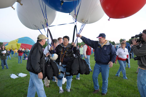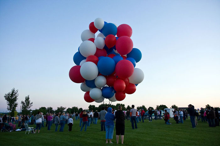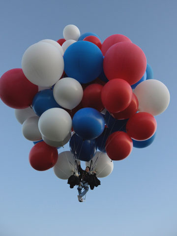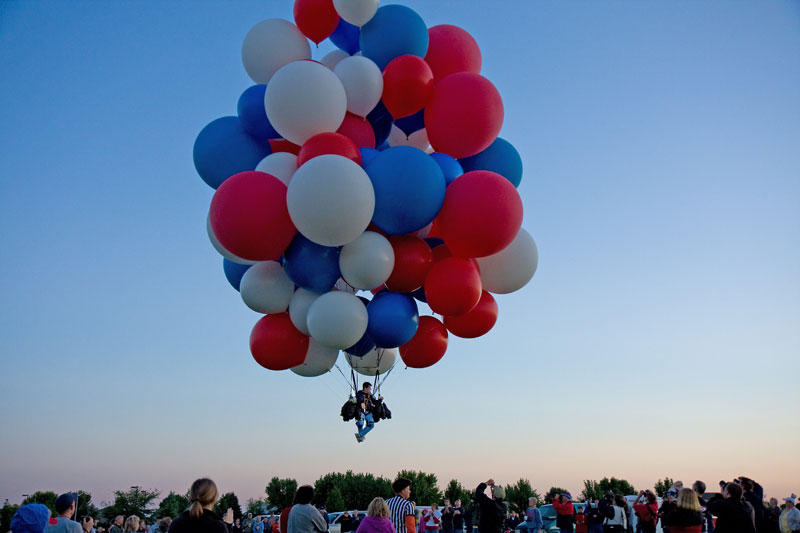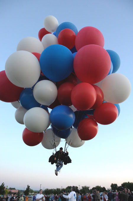 But perhaps my own gambling blood was up, or perhaps the thought of returning for a fourth year of wind and/or rain was just unbearable. In any case, I signaled to the crew to release me, and my balloons carried me up into the the skies over South Dakota. |
