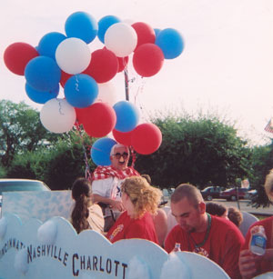 Local balloonist Wayne Fortney invited me to Kingsport to fly in their balloon rally, which is part of the city's week-long summer Fun Fest. Wayne had arranged for the local Tri-Cities Regional Airport to sponsor my flight. The airport was engaged in an ad campaign to convince people in Kingsport and neighboring towns to take commuter flights from their facility rather than driving an hour to Knoxville or another airport. Their ads featured "Joe Frugal", a humorous character who would try various inexpensive but improbable ways to travel. My flight was billed as the "Frugal Factor" -- ignoring the fact that, between balloons and helium, cluster ballooning easily costs ten times more per flight than hot-air ballooning. |