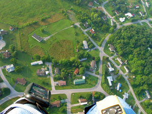 Happily, I saw someone walking up in the field below. It turned out that a couple of spectators at the launch had followed me in their cars from Kingsport. I called down and asked if they would lend me a hand. After making them go from one side of the trees to the other and them back again, based on the shifting winds, I pulled myself from tree-top to tree-top to where I could thrown down a line, which they used to pull me down to the field. I came down without bursting a single balloon. |