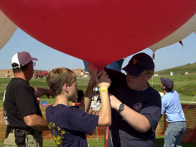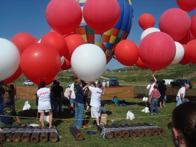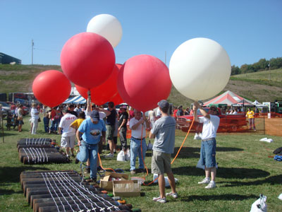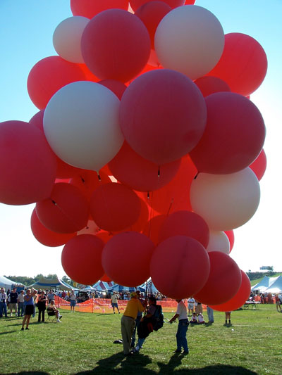 On Saturday afternoon, my crew chief Roland Escher and I began inflating the cluster balloon at Mylan Park. The festival had been plagued by rain for the past several years, but this year it was sunny, the temperature in the high 80s. We were assisted by some local Boy Scouts and their scoutmasters. A few of the boys expressed some disappointment at having to help us while the Miss Balloon Festival teen pageant was going on, but most bore this loss manfully, and soon my 86 balloons were all inflated. |
