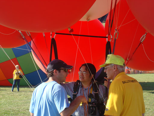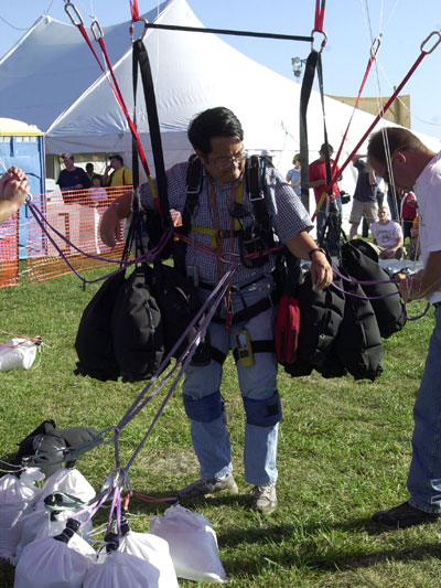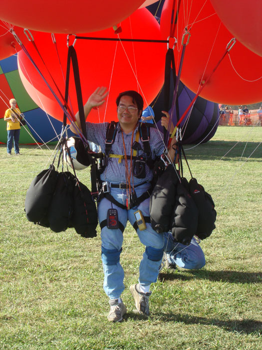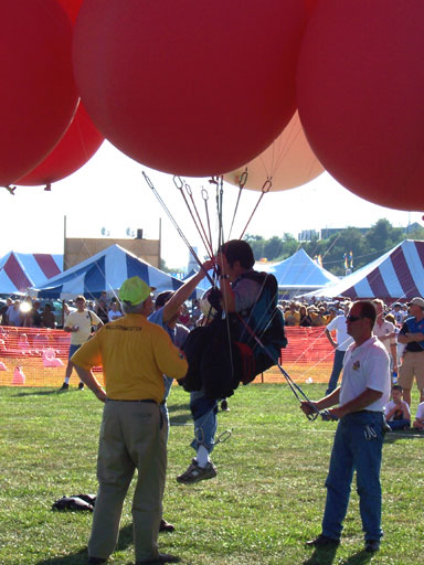 | I got into my harness and crew attached the huge red and white balloons to me. My friend Bob Redinger was setting up his hot-air balloon a short distance away, preparing to accompany me on the flight. After a few last words with Roland and balloonmeister Van Anderson, I was ready to go. |