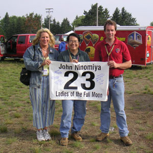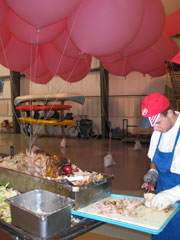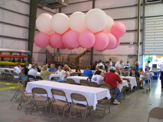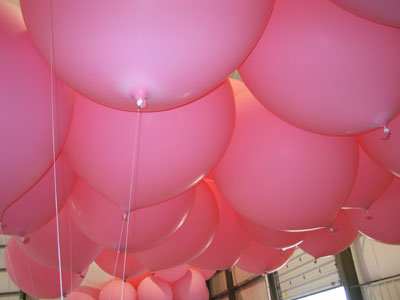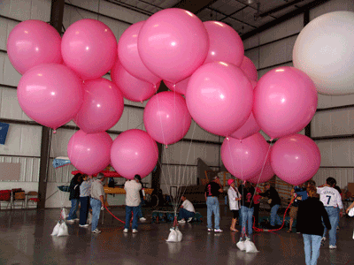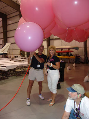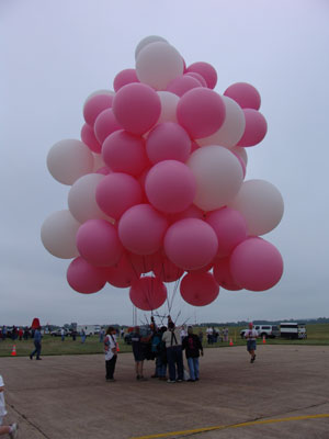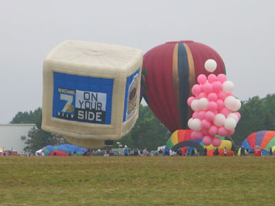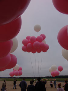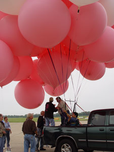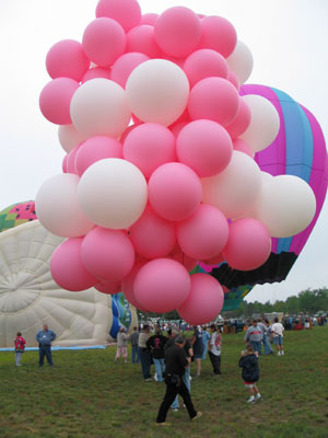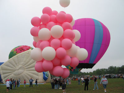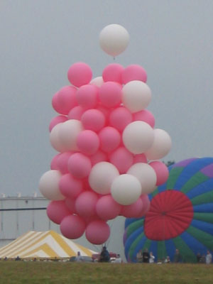 The Wausau Area Balloon Rally takes place in early July and is the brainchild of local businessman and balloonist Steve Woller. When I got in touch with Steve early in the year, he expressed interest in having me do a cluster flight at the rally, and said he would try to find a sponsor for me. The sponsors who Steve found for me were the Ladies of the Full Moon, a local women's group devoted to taking over local bars and restaurants on full moon nights. Steve assured me that these events were social and generally peaceful. The head Lady, Christine Kysely, asked if I could fly with pink and black balloons, to match the group's colors; however, the choice of colors in giant balloons being somewhat limited, we settled for 5' pink and 7' white balloons, in a kind of polka dot pattern. Christine assured me that the Ladies would show up at 4:15 in the morning to inflate my balloons and send me on my way with the hot-air balloons at sunrise. |