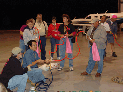 The inflation went smoothly, but the weather did not improve. When the hot-air balloons arrived at 5:45 for the pilot briefing, Steve put the balloon launch on hold. At this point, the cloud ceiling dropped even farther, obscuring the top of nearby hills, and the wind came up. Finally, after an hour, it was decided that the balloons should just do a short hop across the airport grounds for the spectators, but no real flights would be allowed. It was a disappointment, but there with conditions the way they were it would be dangerous to fly, as well as illegal. So, not altogether happily, we put the cluster together to get ready for the show. |