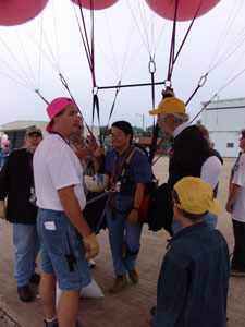 At that point, all there was to do was wait. Possibly the balloons would still be buoyant enough to lift me and a safe amount of ballast when the winds calmed down enough to fly that evening -- I'd never had to do this before, so it was hard to guess. I knew that if left outside in the wind and heat all day, the balloons probably wouldn't be in very good shape -- but in an air conditioned hangar, maybe they would be OK. Of course, even if the balloons survive, we were still counting on the weather to cooperate for the evening flight. At 10 AM, the clouds burned off and the day was finally sunny, as originally advertised. Ernie and I went back to the motel for a few hours, and I took a nap. |