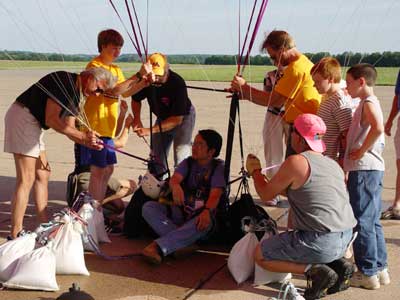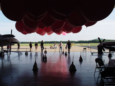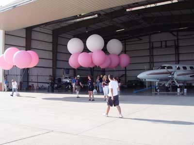 The crew walked me out to where the hot-air balloons were setting up. A large crowd of spectators had come out to the airport to watch the balloon launch. The wind was 5 or 6 knots, which is about as much as you'd want for launching a cluster balloon. However, the forecast was for the winds to die down at sunset, and having gone through all of this, I was not going to miss my chance to fly. Four of the Ladies and their gentlemen pulled me upwind to where the other balloons were. I waited there for my time to launch. |