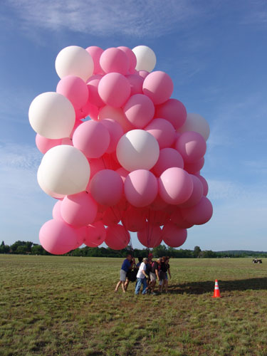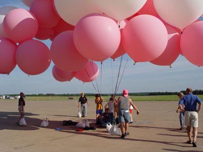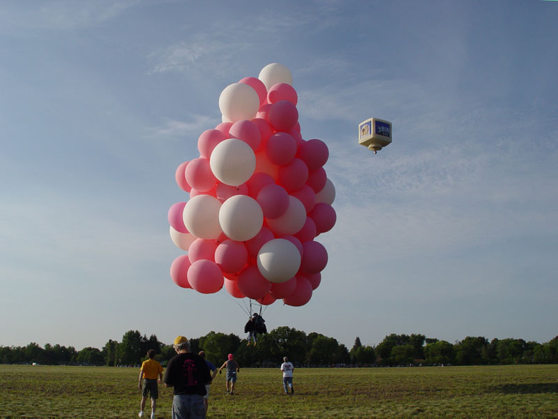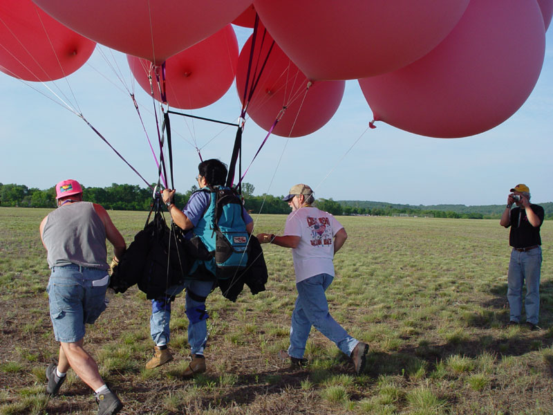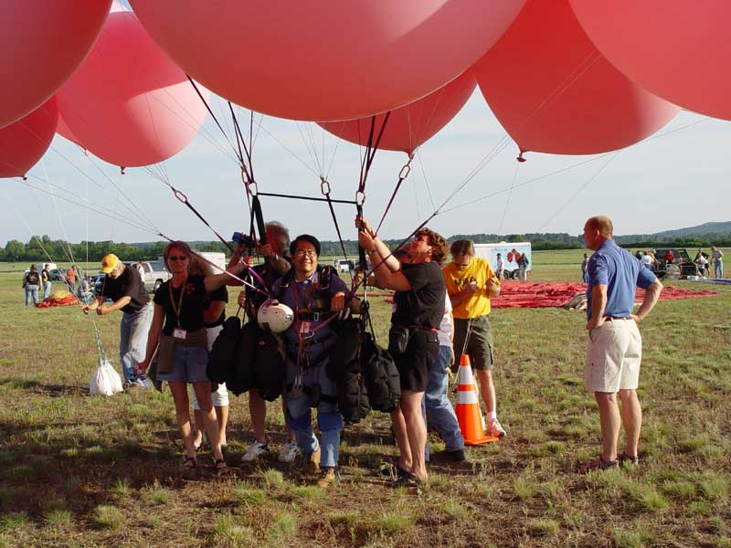 I got into my harness and had the crew began hooking the balloons to me. This was the critical part, when I would find out how much lift I had lost over the last 12 hours. To my relief, with the 12 additional balloons hooked on, I was still buoyant enough to carry my full normal amount of ballast. I could fly! |