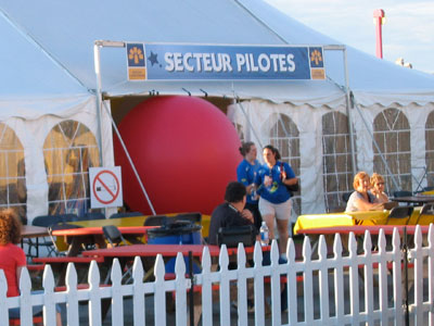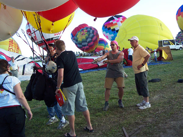 Crew walked me out to the area where the spectators were. There was still a bit of breeze; Ernie and Jacques were holding me back to keep the wind from dragging me. I was interviewed by one of the festival announcers over the PA system, and then it was time to go. |