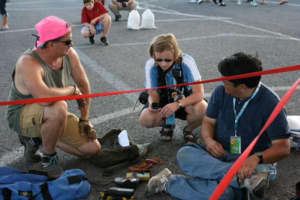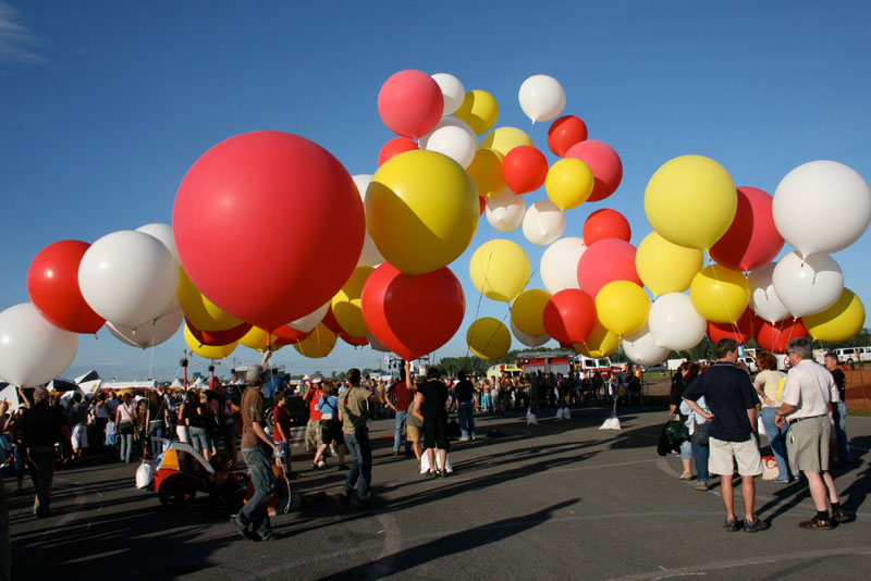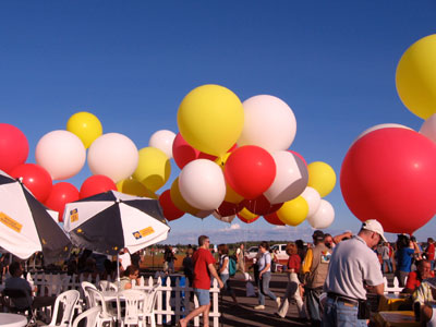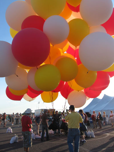 Outside the tent, the crew attached the inflated balloons to sandbags. We had filled the sandbags extra full, anticipating the wind, so none of them quite dragged. But the balloons were leaned way over with the breeze, one of them hitting the tarmac and bursting in a gust. |