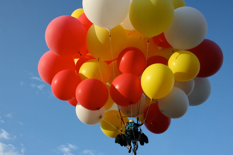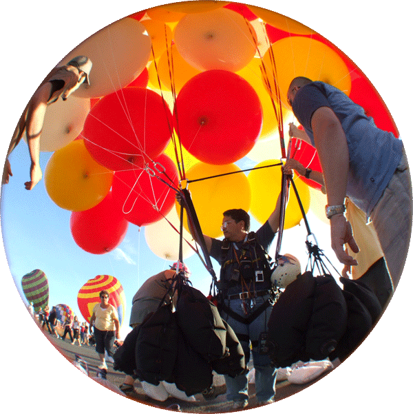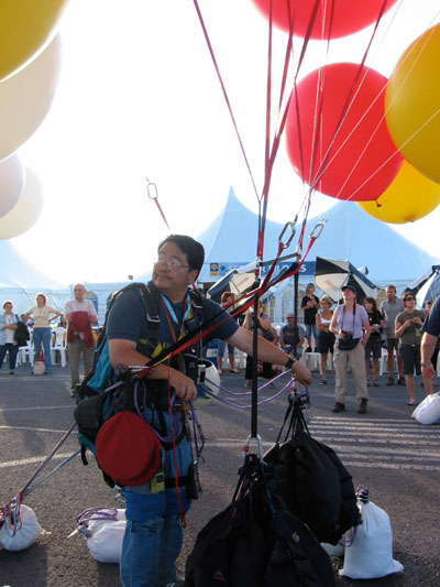 Gradually, the wind began to slow. I got into my harness and the crew attached the balloons to me. |