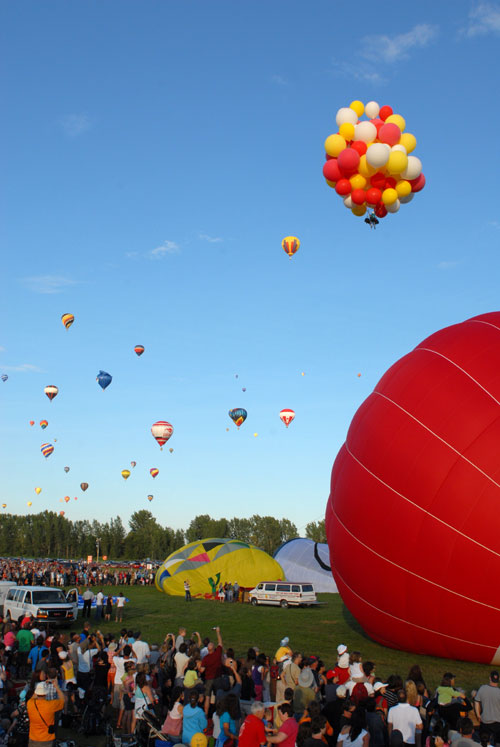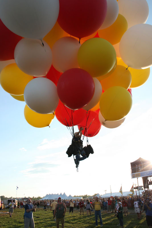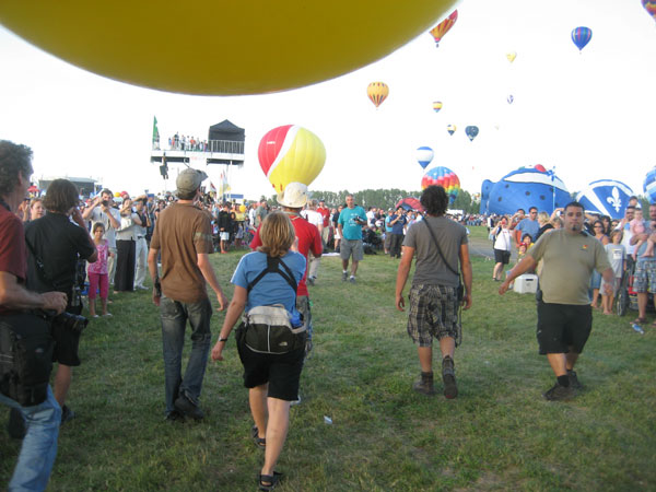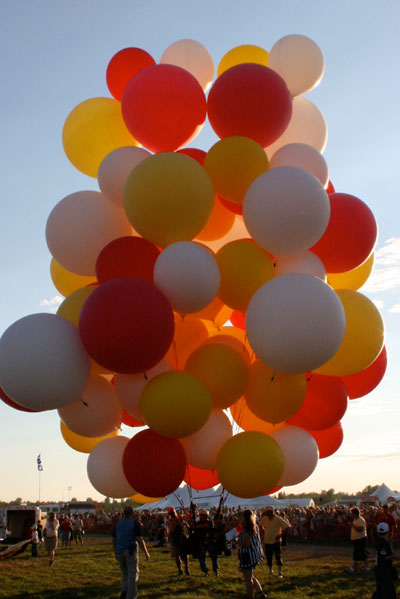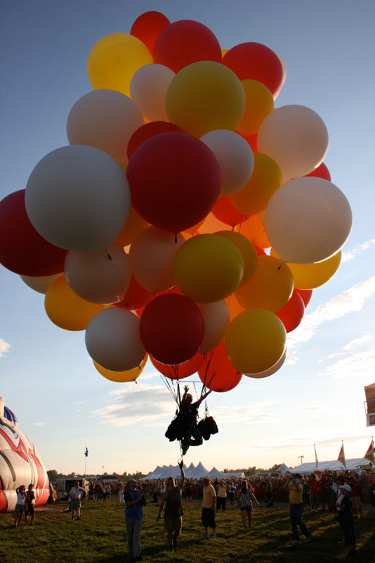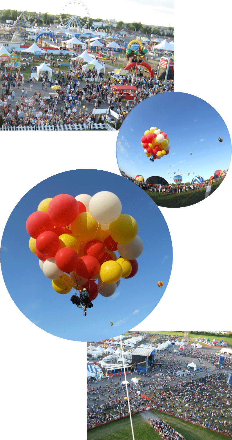 The crowd cheered, giving voice to my own elation at finally rising into the skies of Quebec with my wonderful red, white and yellow helium balloons. |