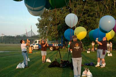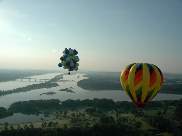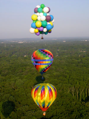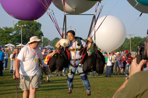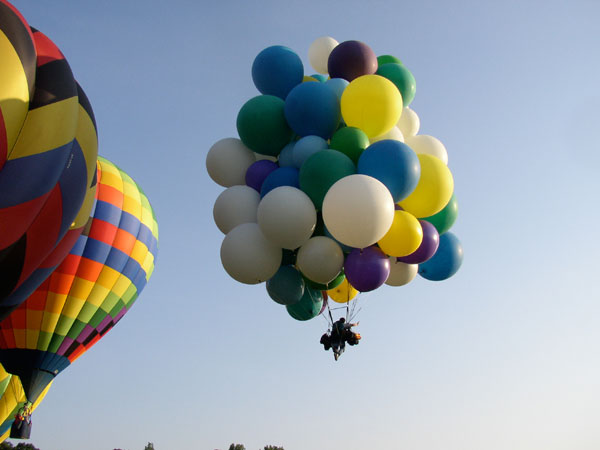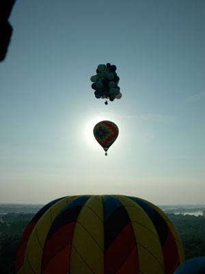 I had crew release me. My balloons pulled me lightly off my feet, carrying me up into the air while the huge hot-air balloons rose up all around. |