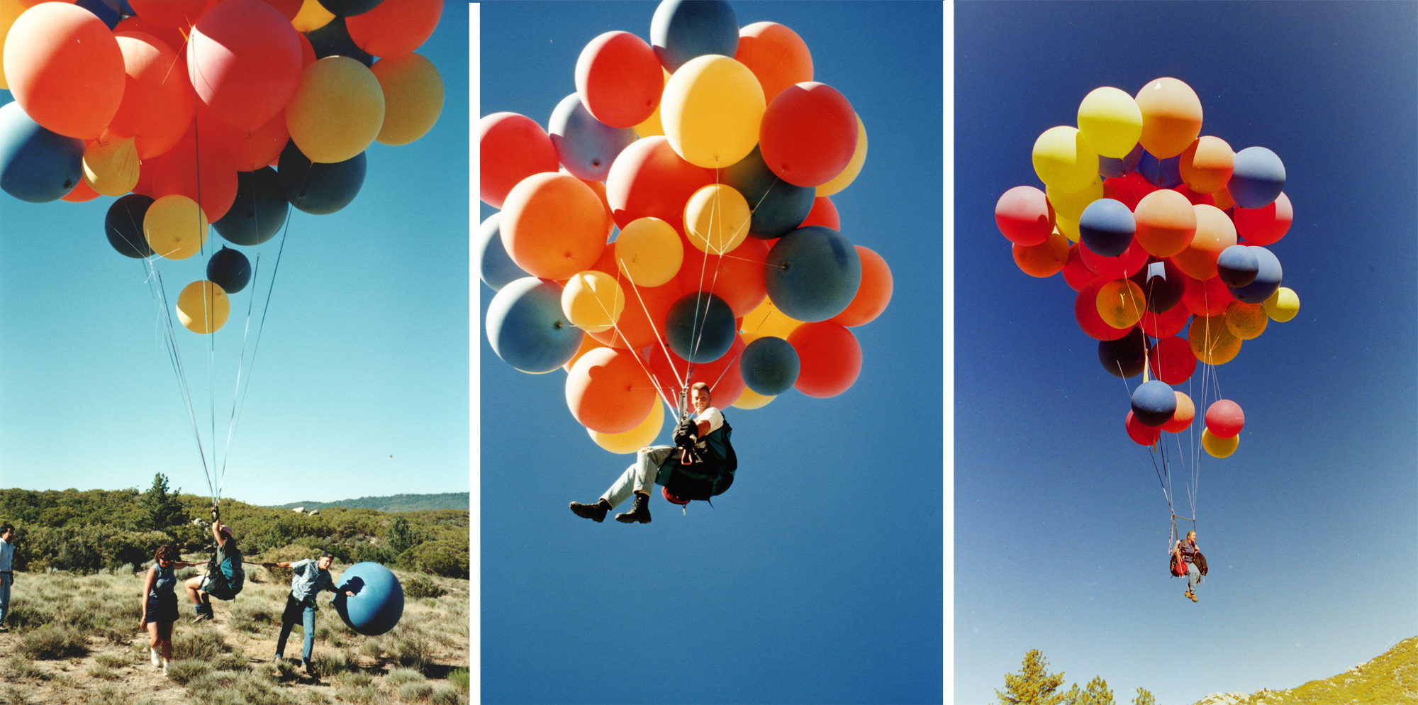 "Fifteen years ago today on July 2, 1982, a man named Larry Walters, a thirty-three-year-old truck driver from Southern California, decided to go for a balloon flight. Knowing nothing about ballooning or aviation, Larry filled forty large weather balloons with helium , tied them to his lawn chair and with the help of friends, took off. He only intended to ascend to a few hundred feet, but due to some basic misunderstanding of ballooning physics, he ended up at 16,000 feet over the Los Angeles area. He flew for three hours and was seen by numerous jet airline pilots flying in and out of LAX. At the end of that time, he landed safely, and walked into the waiting arms of local police, and the FAA, who fined him several thousand dollars....