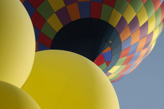 The wind bounced the balloons against one another hard enough to burst one. But it was never quite strong enough to drag the balloons on their sandbags, and continued to slowly subside. The inflation volunteers finished their work in record time. By the time I got into my harness, conditions were ideal for flying. The crew walked me across the road, to where the hot-air balloons were getting ready to launch. |