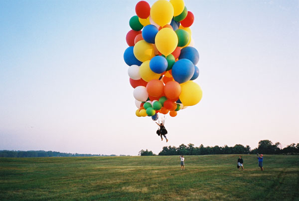 Ernie released my tie-down rope, and the balloons started to pull me forward. I jogged forward to keep from being dragged, and crew followed. As I had suspected, as I gained speed, I found that I was no longer positively buoyant. I handed off the ballast bag I had unhooked to one of the crew jogging along behind me. The balloons attached to my legs pulled my feet up off the ground behind me, and the bunches of balloons in each of my hands pulled me up. And off I went on my adventure. |