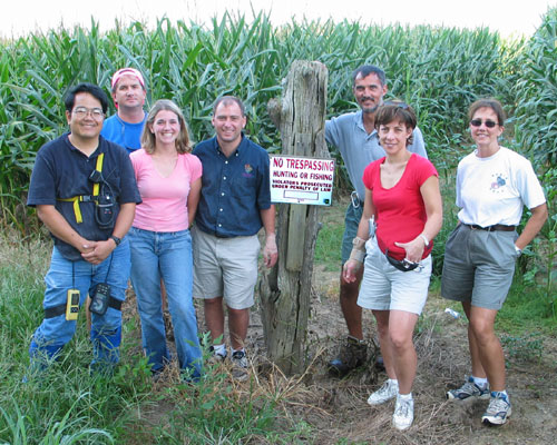 Finally, nearly an hour into the flight, my crew radioed to say that they were getting pretty close to catching up with me. I had been descending steadily for the last twenty minutes, and was now at just a few hundred feet. Ahead were several large corn fields, with a line of trees and a stream running through the center. A road ran from the main road out to a bridge that went over the stream. I described the location as best I could to my crew. They seemed clear on what main road I was talking about, but not clear on the exact location. I was still moving fairly briskly. I didn't want to wait for the windspeed to increase on the surface, so I decided that I would land -- easy enough if crew was there to grab me, probably unpleasant if I had to stop myself in the corn field. I released a balloon to drop in farther, dropped a little ballast to level out again. I was into the corn field, then I was moving along the tops of the trees. I saw vehicles on the road into the corn field -- crew was there! They pulled up out of sight, where the road crossed the stream and the line of trees. "Dropline," I yelled. "Dropline-dropline-dropline!" Clutching the roll of webbing strap, I cleared the last of the trees and saw people down on the road, one of them with a pink hat. |
