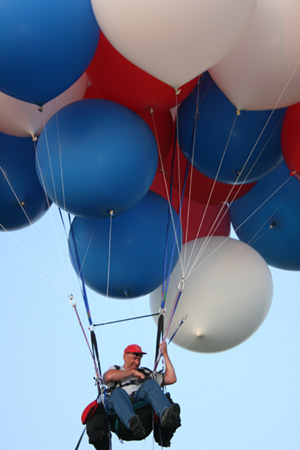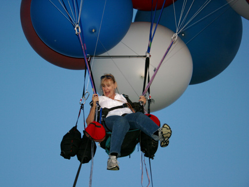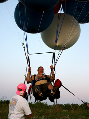 After a few minutes Mary Jo returned with my truck following her. We asked Don if he wanted to go up on tether before we put the balloons away. He'd gone on his first hot-air balloon ride just a few weeks before, and was ready to give the cluster balloon a try. So we let him up on tether, followed by Mary Jo and our volunteer crew from the Classic (Mark, John, Shea and John) and my girlfriend Marj. It was full dark by the time we put the balloons away and bade our hosts good night. |