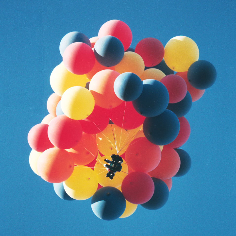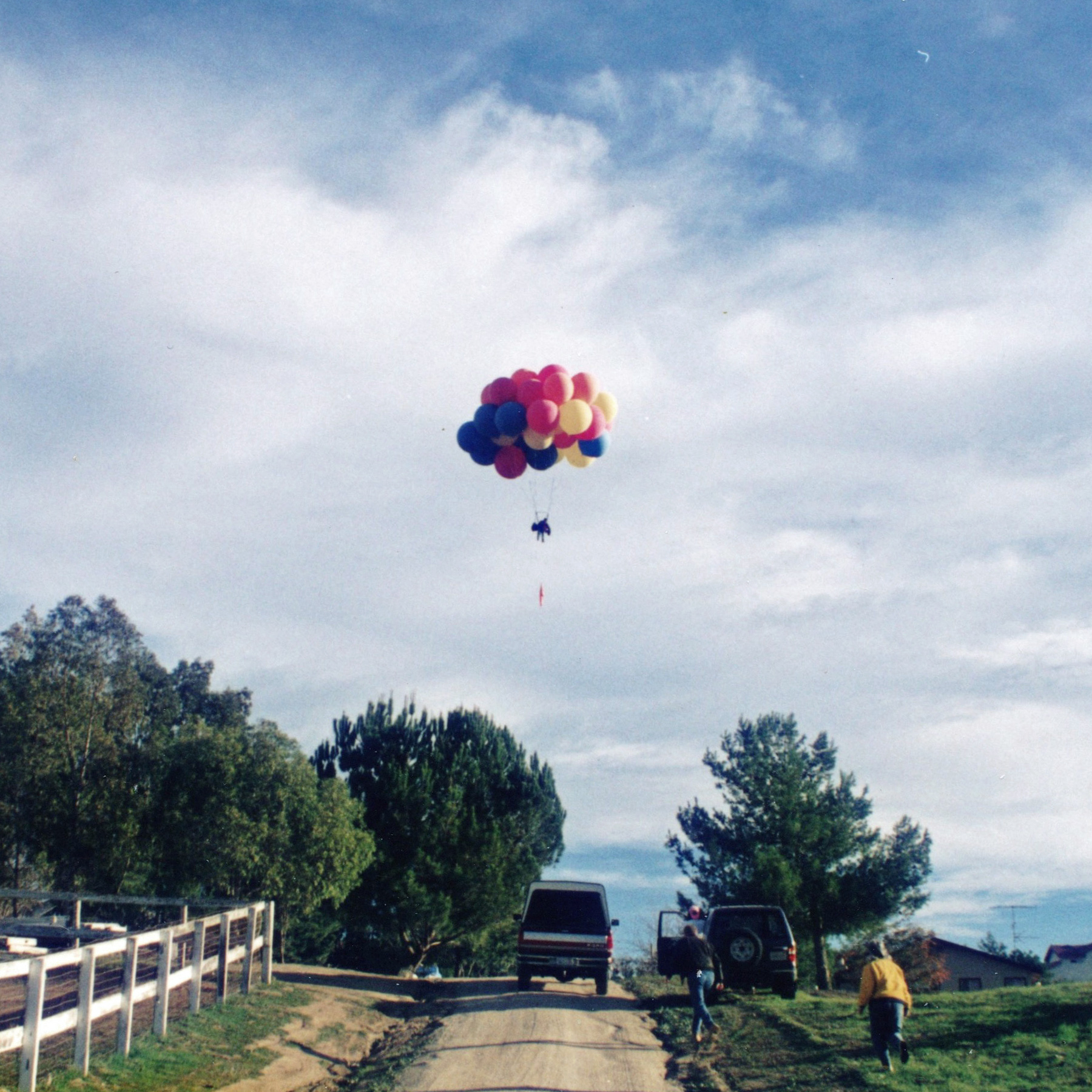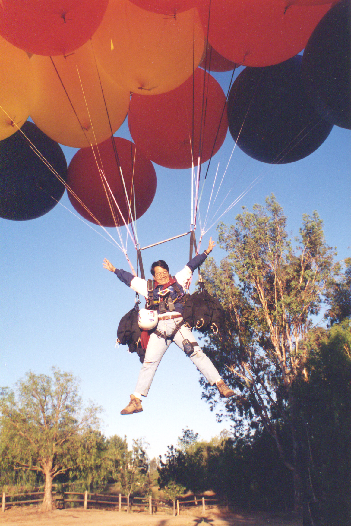 in a harness tied to a cluster of large orange weather balloons. "Ballooning