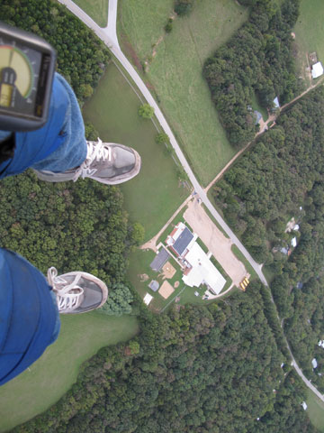 I dropped ballast to clear the trees, then released a balloon to set up a descent to where Bob and Brian were waiting for me on the gravel road -- a perfect landing, other than Brian's insisting on holding me up by one foot for pictures before letting me land. |